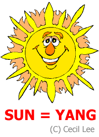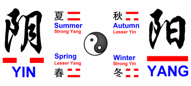 The female principle of yin is associated with the earth, with the North and cold. Originally, Yin means `shady side' which is the side of a mountain which is not facing the sun. The word is also used to mean the dark, cold room in which ice was stored in summer. Yang is related to Heaven, South, the Emperor, the dragon and all uneven numbers are yang-numbers.